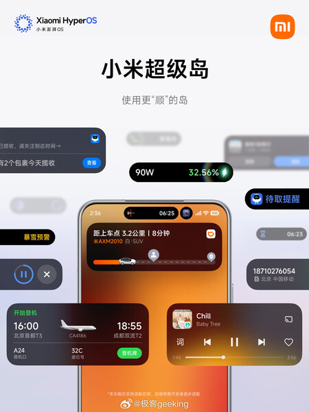 La 'Super Island' de Xiaomi es un módulo dinámico con forma de píldora alojado en la parte superior de la pantalla. Este módulo puede albergar hasta tres widgets de aplicaciones en vivo, como música, alarmas, reuniones, notificaciones de servicios, llamadas y mucho más. De hecho, Xiaomi apunta a que la super isla es compatible con más de 70 servicios integrados en HyperOS 3.